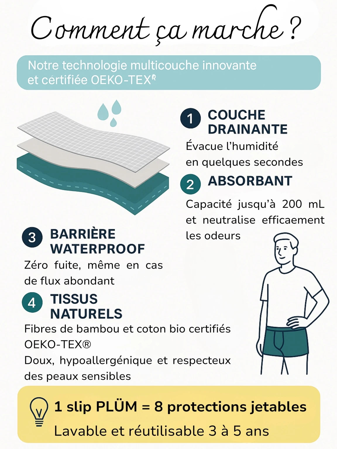 Conçu avec des professionnels de santé et fabriqué en fibres de bambou certifiées OEKO-TEX®, ce slip respecte votre peau tout en étant lavable et réutilisable pendant 3 à 5 ans.